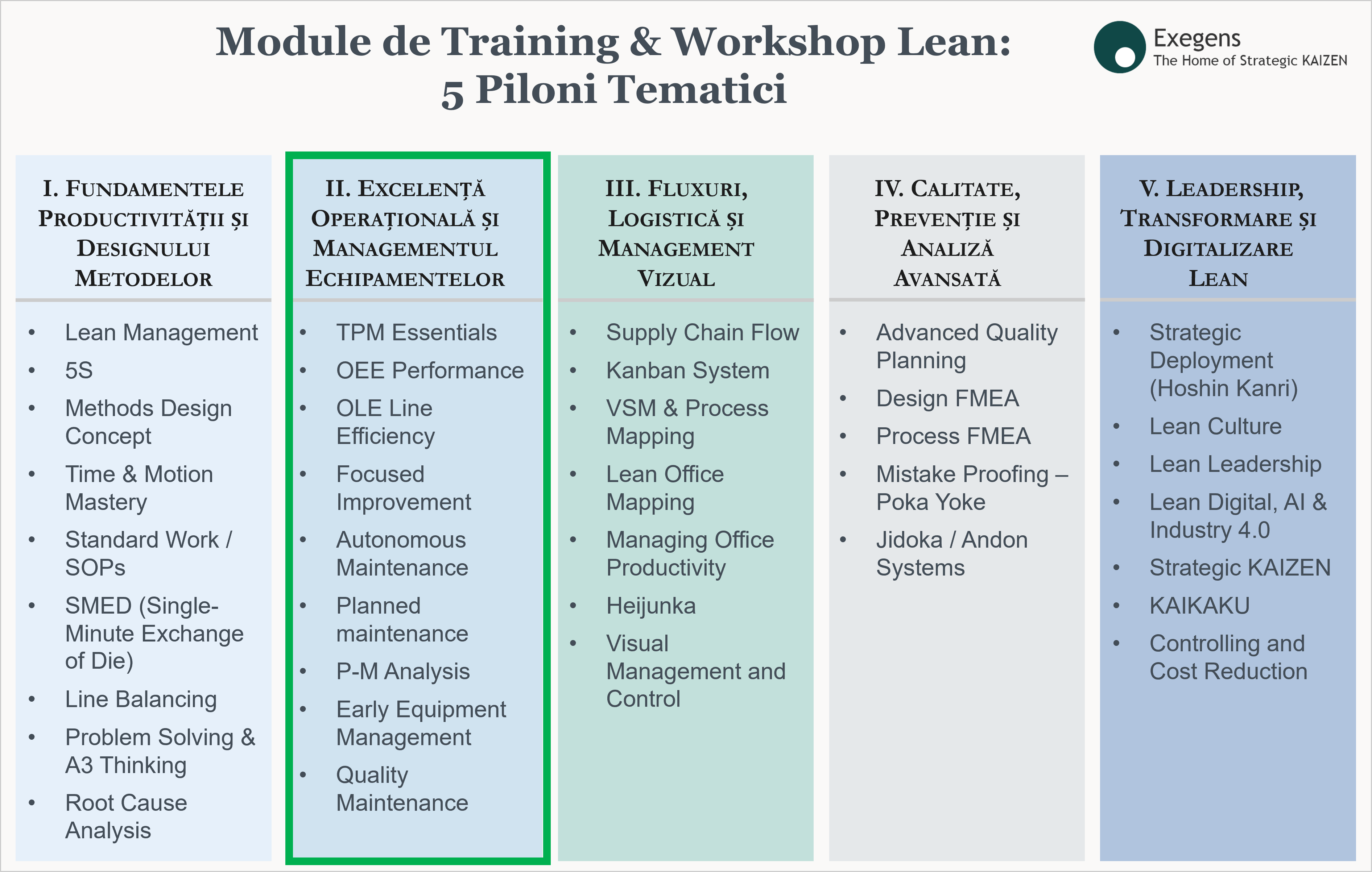Această a doua suită consolidează arhitectura modulară Lean & Kaizen, activând pilonul fiabilității și controlului operațional. Trainingurile și workshopurile sunt concepute pentru a construi o înțelegere solidă a principiilor de utilizare eficientă a echipamentelor, mentenanță planificată și stabilitate operațională.