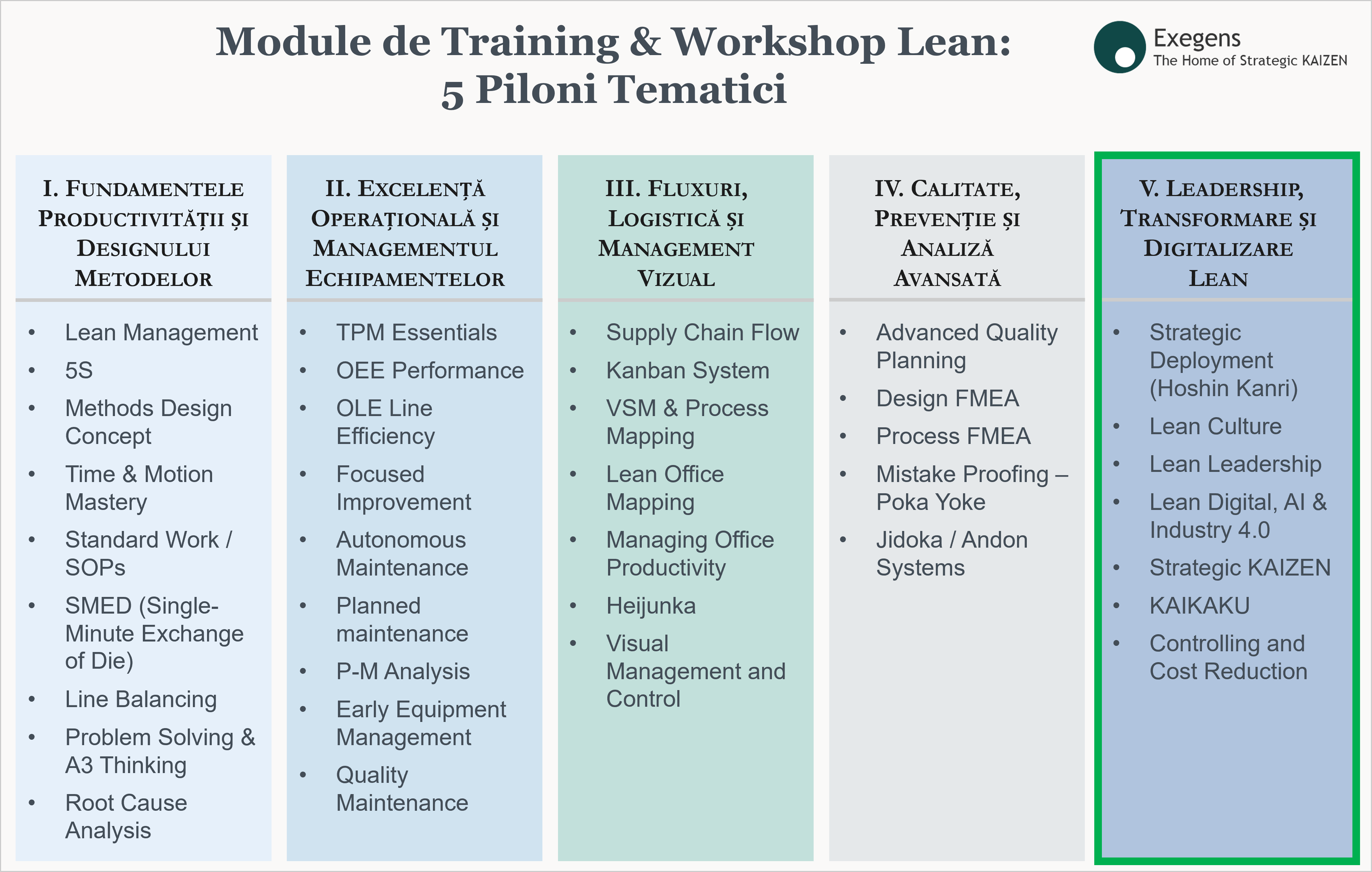 Această a cincea suită consolidează arhitectura modulară Lean & Kaizen, activând pilonul deciziei strategice, al transformării operaționale și al digitalizării inteligente. Training-urile și workshop-urile sunt concepute pentru a construi o înțelegere solidă a principiilor de leadership transformațional, guvernanță Lean și integrare digitală aplicată.